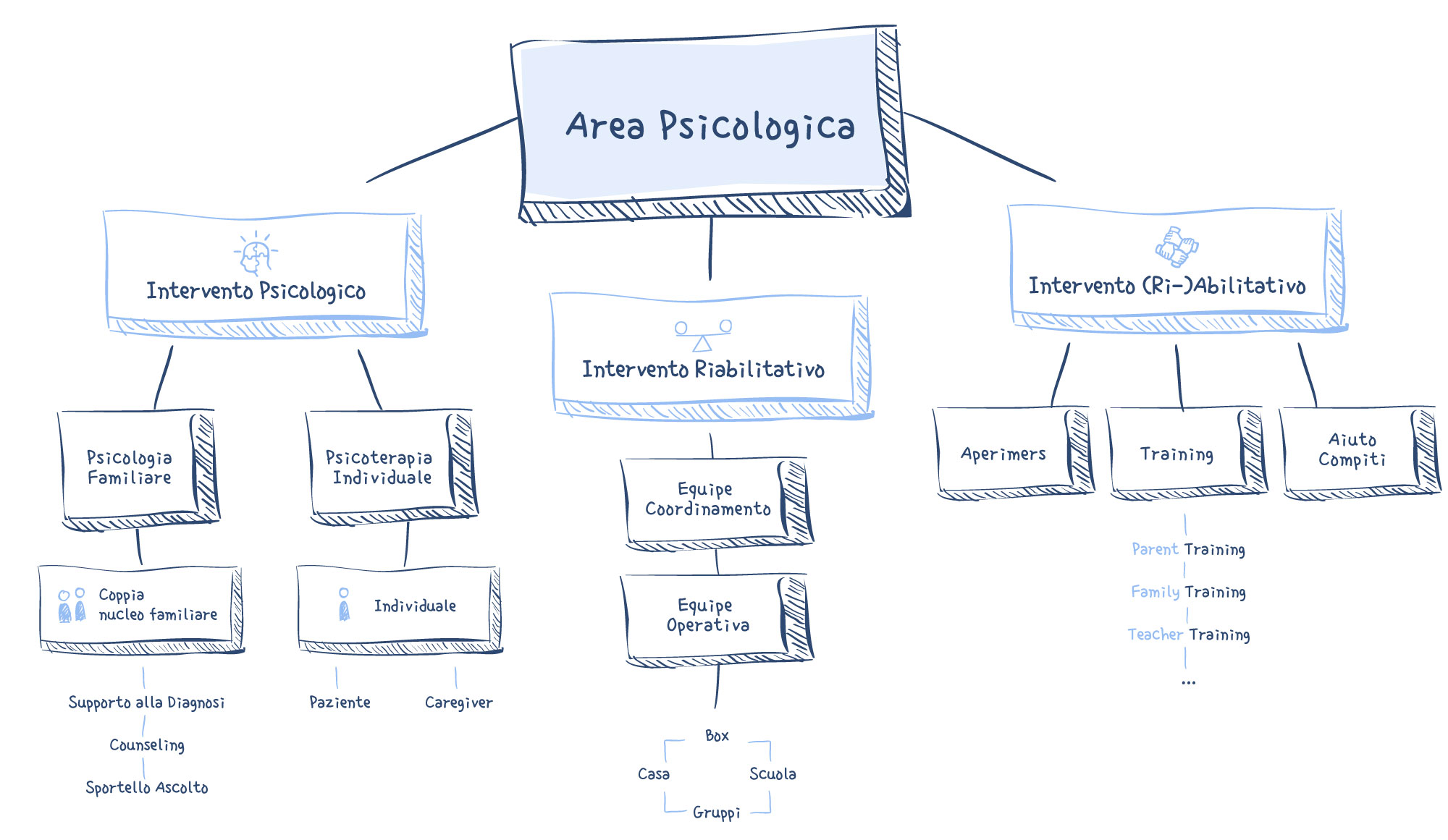 A Bluemers crediamo che la sinergia tra differenti professionalità sia fondamentale per promuovere un modello clinico-riabilitativo efficace. All’interno dell’Area Psicologica vengono strutturati tre tipi di servizi: Intervento Riabilitativo, Intervento Psicologico, Intervento (Ri-)Abilitativo.